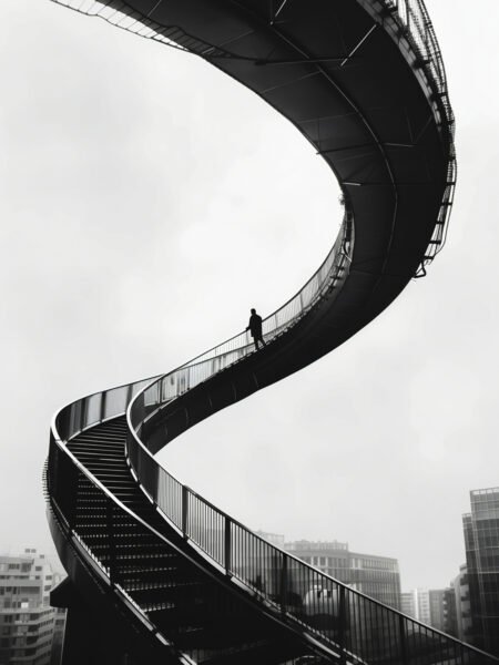 This black-and-white photograph captures a pedestrian walking on a winding modern skybridge. The curvilinear design of the bridge stands out against the empty background, creating a visual effect of endless extension. The figure of the walker appears solitary yet resolute, symbolizing an unending journey and exploration in modern urban life.