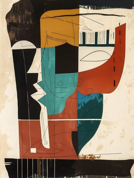 This abstract artwork employs a rich palette of colors and geometric shapes to create a complex and multi-layered composition. The contrast between dark and bright tones, along with fluid lines, evokes a sense of visual intricacy. Each color block and line seems to narrate an independent story, intertwined to form